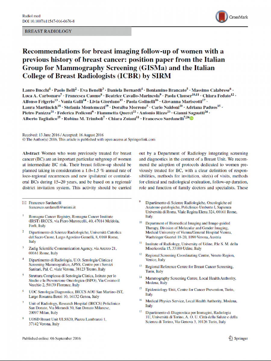 Il documento fornisce indicazioni per il follow-up senologico delle donne con storia di tumore mammario. Il testo è stato redatto da membri delle due organizzazioni e approvato dal Comitato di Coordinamento del GISMa e dal Comitato Direttivo della Sezione di Senologia SIRM.