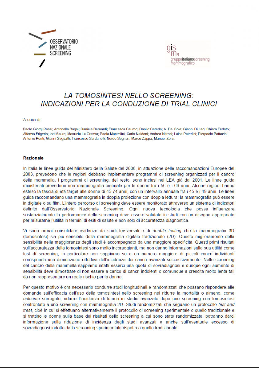 Il documento riporta gli obiettivi principali di due studi italiani sull’uso della tomosintesi nello screening mammografico e fornisce indicazioni sulle caratteristiche necessarie ad uno studio sperimentale per raggiungere tali obiettivi.
